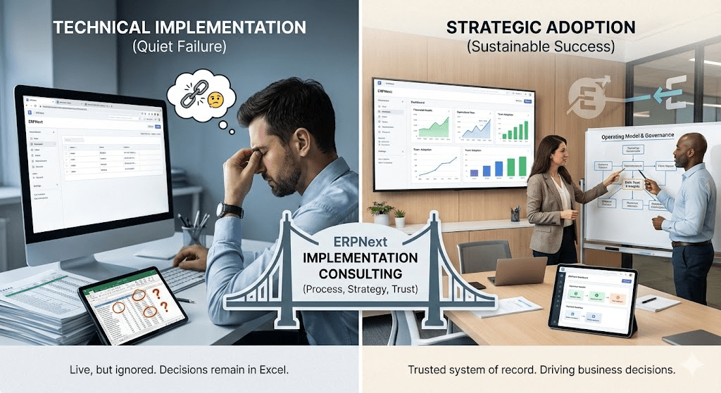 ERPNext doesn’t fail loudly. It fails subtly: data becomes questionable, reports are ignored, teams revert to spreadsheets, and leadership stops trusting the system. At that point, the ERP still exists—but it no longer matters.